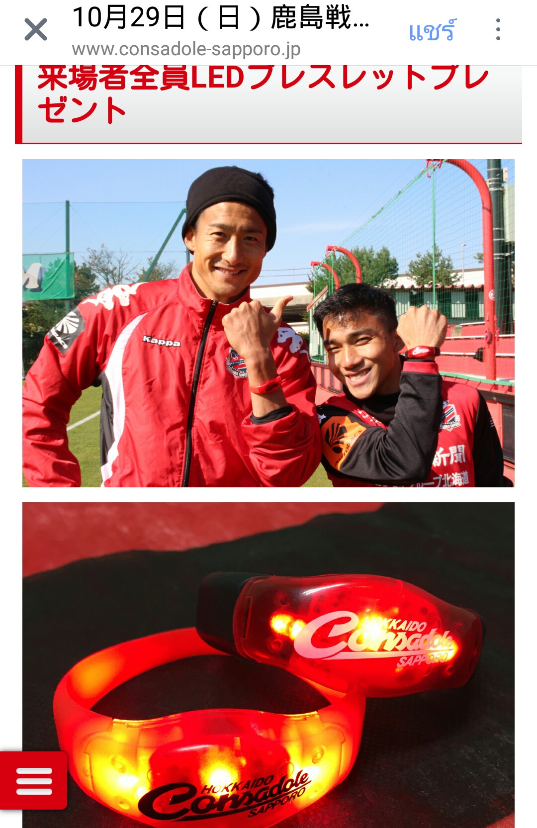 อ่านญี่ปุ่นไม่ออกครับ พอดีเห็นแฟนเพจคอนซาโดเล่ เดาว่าชวนให้แฟนๆมาดูที่สนามให้เยอะๆ มีแจกสายรัดข้อมือมีไฟ 30,000ชิ้น โทคุระนี่เป็นเอสของทีม หนีบเจมาช่วยโฆษณาด้วย แสดงว่าเจนี่ดังใช้ได้เลย ผิดถูกขออภัยล่วงหน้า อ่านญปไม่เป็นครับ