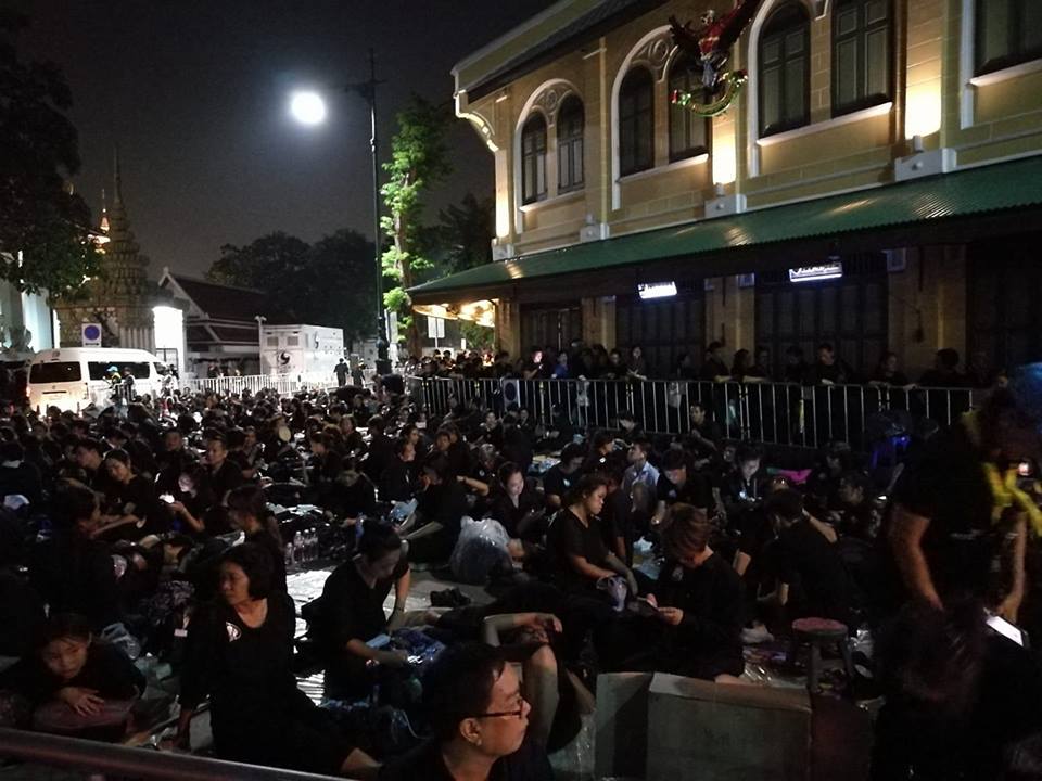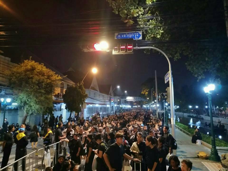 สถานะความยาวแถว : ยาวมากๆ อยู่บริเวณนอกสนามหลวงและจุดคัดกรองอีกมาก ท้ายคิวอยู่ที่ : บริเวณกองสลากเก่า และวงเวียนรด. ประตูที่ใช้เข้ากราบสักการะฯ : ประตูวิเศษไชยศรี *หมายเหตุ1 แบ่งแถวหน้าจุดคัดกรองโรงแร