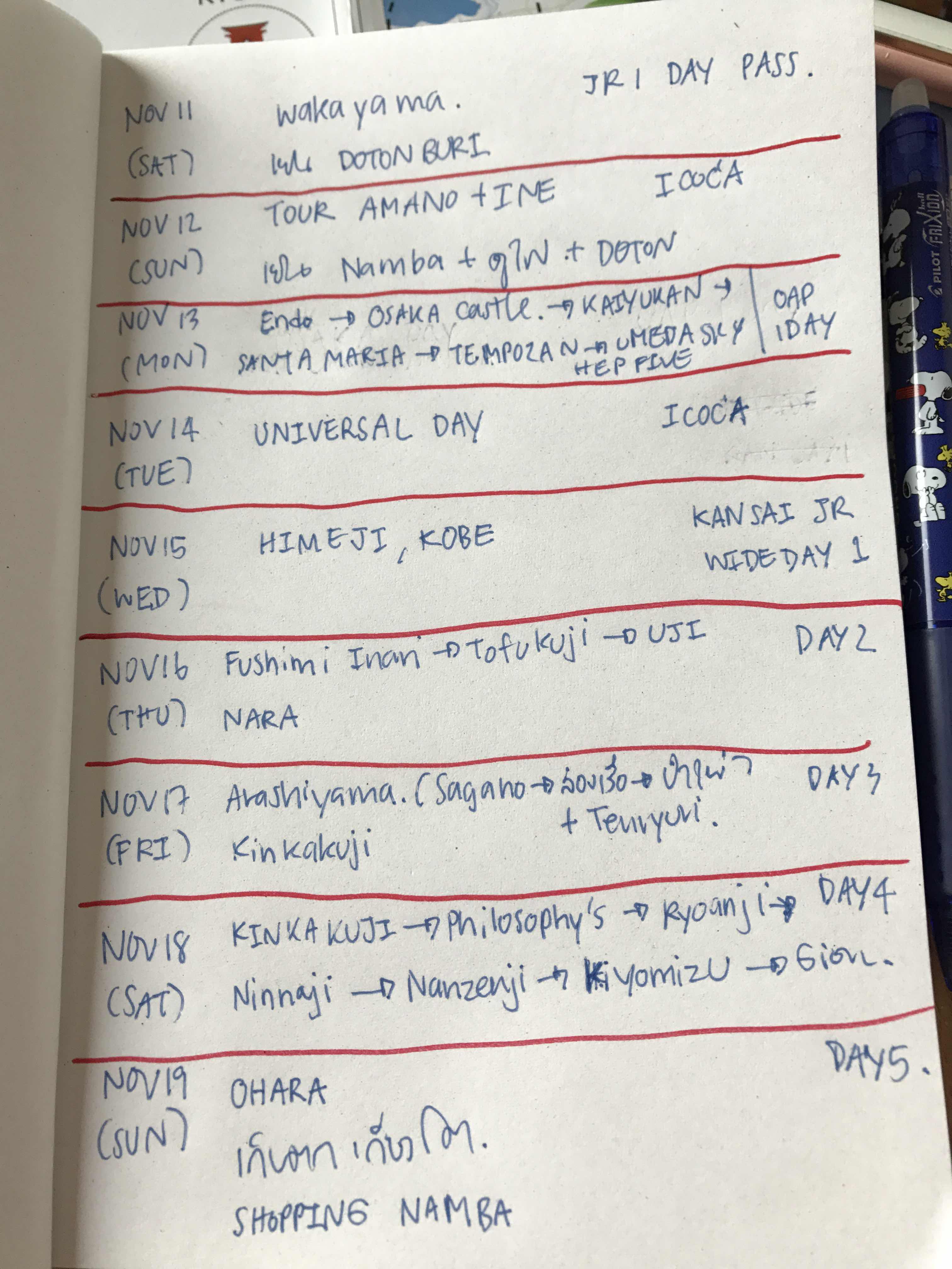 วางแผนเที่ยวช่วงใบไม้แดงครับ รบกวนพี่ๆช่วยตรวจการบ้านหน่อยครับ ว่าแพลนนี้เป็นยังไงบ้าง day1 ถึง kansai airport 22:40 เดินทางไปพักชินโอซาก้า ด้วย ICOCA & HARUKA pass day2 เที่ยวโอซาก้า ด้วย 1 day