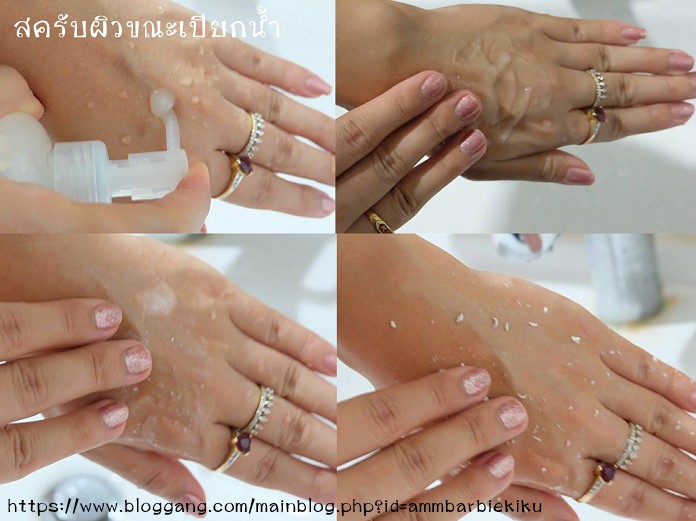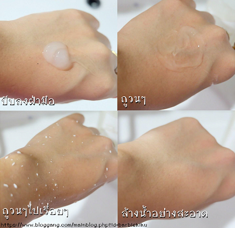 - เราถูๆวนๆไปซักพักจากเป็นเจลจะกลายเป็นเหมือนเม็ดๆสีขาวเพื่อสครับในการขัดเซลล์ผิวให้ดูนุ่ม สะอาดขึ้น