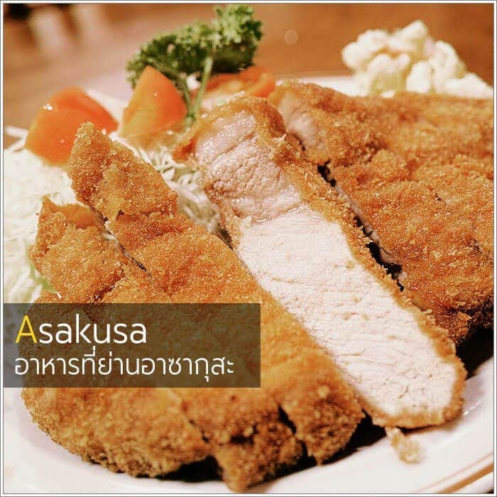 อาหารที่ย่านอาซากุสะ มีขนมน่าตาน่ารักขนมนิงเงียวยา มีทั่งรูปโคมไฟและรูปเจดีย์ รูปเทพอัสนี มีขนมแป้งทอดที่สอดไส้ถั่วแดงเวลากัดมีความหวานหอมแก้หนาวได้ด้วย มีขายเป็นชุด 4 ชิ้น 300 เยน หาซื้อได้ที่ร้าน Kimuraya Honten และมีร้านขายขนมที่เหมาะกับฤดูร้อนคือ ซอฟท์ครีมใส่โคน 30 รสชาติ อย่างชาเขียว ช็อคโกแลต รสบ๊วย และรสถั่วเขียว มีเมล่อนปัง น้ำแข็งใส และอาหารคาวที่ร้าน Kagetsudo, ข้าวหน้าหมูเทมปุระที่มีชื่อเสียงมานาน กว่า 150 ปี มีเทคนิคการทอดที่มีมาสมัยเอโคะมีน้ำซุปที่หอมหวาน มีกุ้งทอดที่สีทองอร่ามมาลองชิมสิคะ ที่ร้าน Sansada ร้านราเมง มีสาขาทั่วประเทศการหมักเนื้อหมูที่ได้รสกลมกล่อม มีที่ร้าน Kagertsu Arashi Ramen เท่านั้น และมาที่ย่านอาซากุสะจะได้เห็นอาคารของบริษัทอาซาฮีเป็นสีทองเหมือนฟองเบียร์ สร้างโดยสถาปนิกชาวฝรั่งเศส มีความสูงเป็นที่สองของโลกมาตึกนี้ ขึ้นไปมีร้านอาหารและเห็นสามารถเห็นสะพาน Azumabashi Bridge หรือสะพานแดงที่ใช้เดินข้ามแม่น้ำ Sumida เป็นจุดที่นักท่องเที่ยวนิยมมาถ่ายรูป และใช้เดินจากย่านอาซากุสะมาที่อาคารเบียร์อาซาฮี