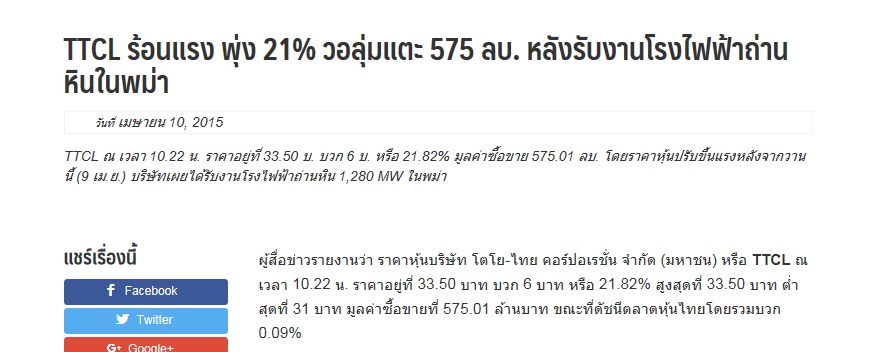 ดูเหมือนว่าเรื่อง ข่าวโรงไฟฟ้าของ TTCL เคยออกมาแล้วครั้งหนึ่งเมื่อปี 2015 ครั้งนั้น พาเม่าไปดอยที่ 33 บาท ปีนี้กลับมาเล่นข่าวเก่ากันอีกแล้วเหรอ นี่คือสาเหตุว่าทำไม ไม่ลากกลับไปไกลกว่านี้ เพราะกลัวเม่าแตกรังหรือปล่าว ใครรู้ทันก็รอด รู้ไม่ทันก็ดอย เออ....ที่แบบนี้ ข่าวหุ้น กับ กลต. ทำไม ไม่ออกมาเตือน รายย่อย ให้ระมัดระวังเรื่องการลงทุน อย่างน้อยต้อง H ให้ชี้แจงเป็น ลายลักษณ์อักษรก่อน