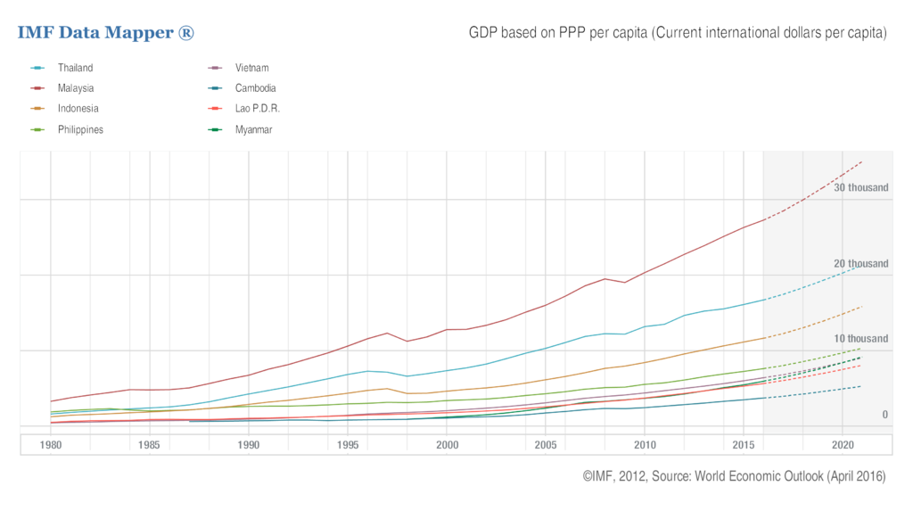 ส่วนมาเลเซียมันนำเรามาก่อนหน้านั้นแล้ว มาเลเซียเป็นอาณานิคมลูกรักของอังกฤษ พวกอังกฤษเลยวางรากฐานไว้ให้เยอะมาก หลายอย่างหลายสิ่ง เอาง่ายๆสมัยก่อนคนทางใต้ที่รวยๆยังส่งลูกไปเรียนที่ปีนังเลย หายากที่จะส่งมาเรียนที่กรุงเทพเพราะทางมาเลฯพร้อมกว่า ครบกว่า เอาข้อมูลหลักอย่าง GDP per capita มาให้ดูว่ามาเลฯมันเหนือกว่าเรามานานแล้ว ยิ่งมาเลฯไปขุดเจอบ่อน้ำมันขนาดใหญ่ทางตอนเหนือของบอร์เนียว ก็ยิ่งทำให้รายได้ของประเทศมากขึ้น รายได้ต่อหัวก็มากขึ้นด้วย เมื่อรายได้มากขึ้นระดับมหาศาล ความเจริญก็เข้ามา