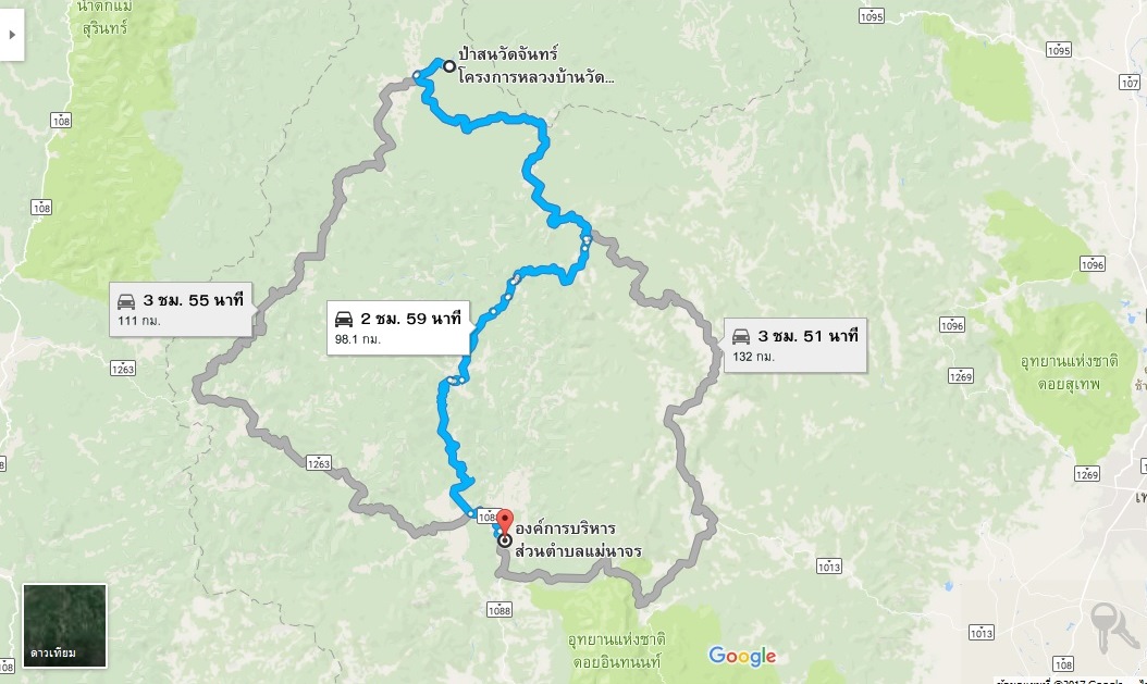 ผมสนใจจะใช้ เส้นทางในภาพ เส้นสีน้ำเงิน จากบ้านแม่นาจร ไปป่าสนวัดจันทร์