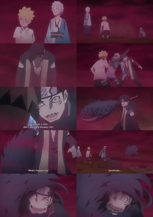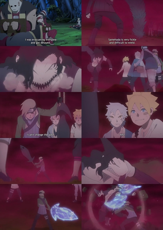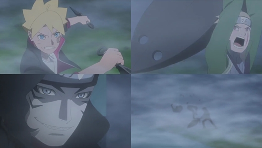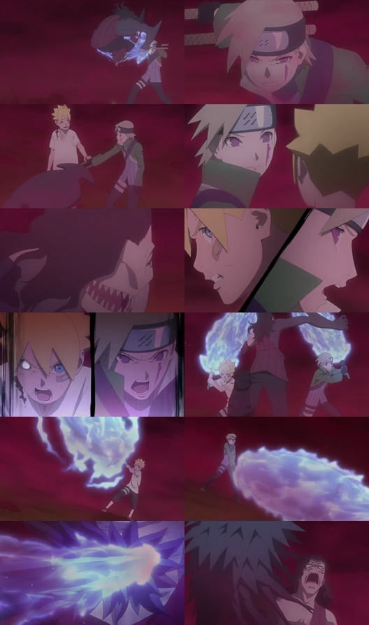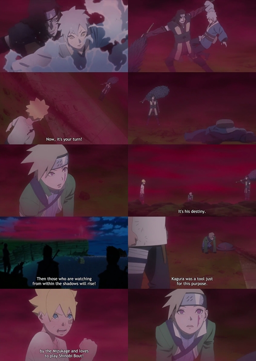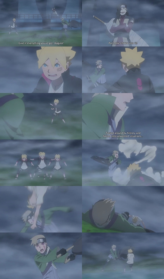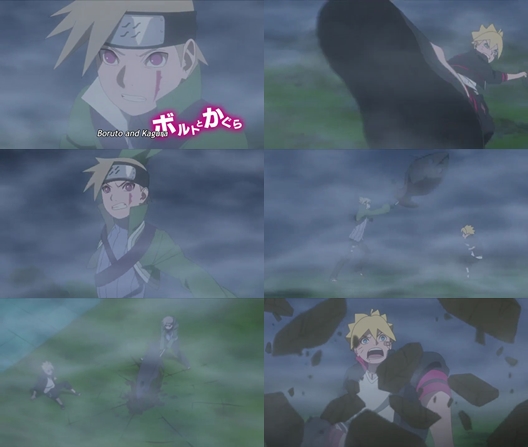 คางุระพยายามจะจัดการแต่ไม่ไหวเพราะโดนดูดจักระไปมาก โบรูโตะมาช่วยด้วย พร้อมคำพูดสไตล์พระเอก และจัดการได้สำเร็จ