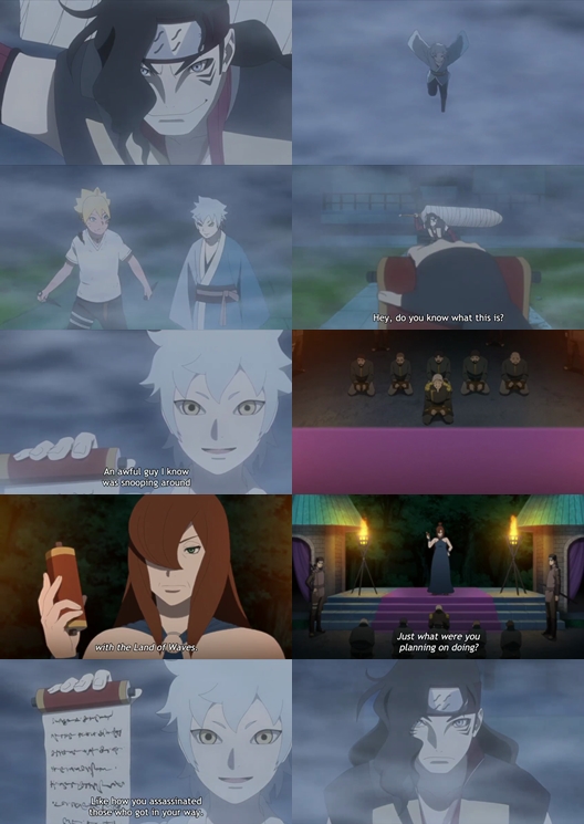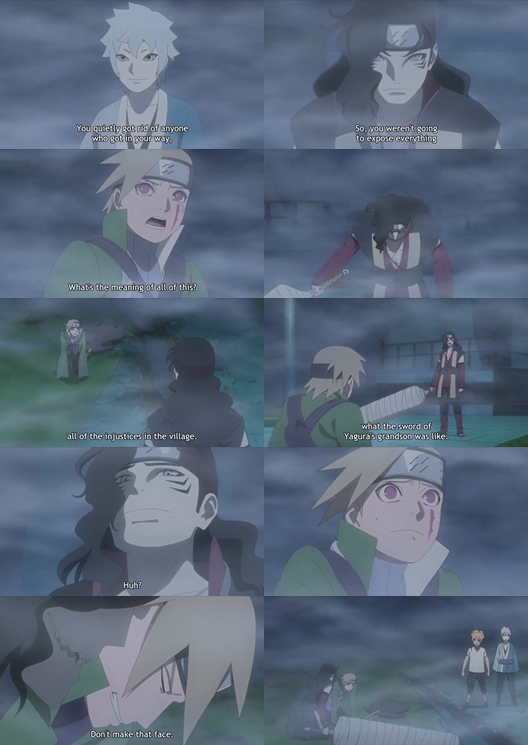 คางุระที่เกิดเสียท่าโบรูโตะ ทำให้ชิสุมะมาลงมือเอง และยังพูดกล่อมคางุระต่อไป คางุระคิดว่าตัวเองคือฆาตกร แต่โบรูโตะบอกว่านายไม่ใช่ ไม่งั้นนายคงไม่ได้ดาบจากมึสึคาเงะหรอก แต่ชิสุมะบอกว่ามิสึคาเงะทำเพื่อกำจัดความขวางทาง โบรูโตะไม่เชื่อชิสุมะ แต่โบรูโตะไม่เชื่อก็ตามใจ เพราะฉันไม่เหมือนพวกเค้าที่จะเปิดเผยทุกอย่าง และสร้างอนาคตที่ดี