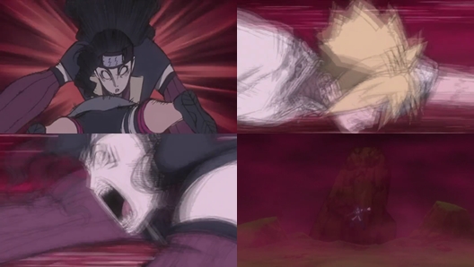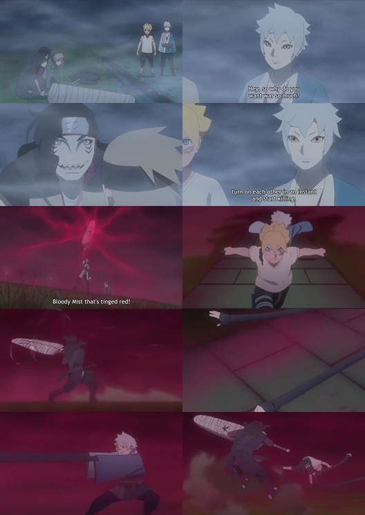 มิสึกิ สงสัยว่าจะก่อสงครามทำไม ชิสุมะตอบว่าเพราะมันสนุกไง และโบรูโตะเห็นว่าชิสุมะบ้า ก็แท็คทีมกับมิสึกิสู้กับชิสุมะ และชิสุมะก็ใช้วิชาหมอกโลหิต