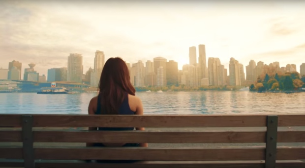 วิวเส้นขอบฟ้าเมืองแวนคูเวอร์จากสวน Stanley Park ปรากฏอย่างชัดเจนภายในเอ็มวี