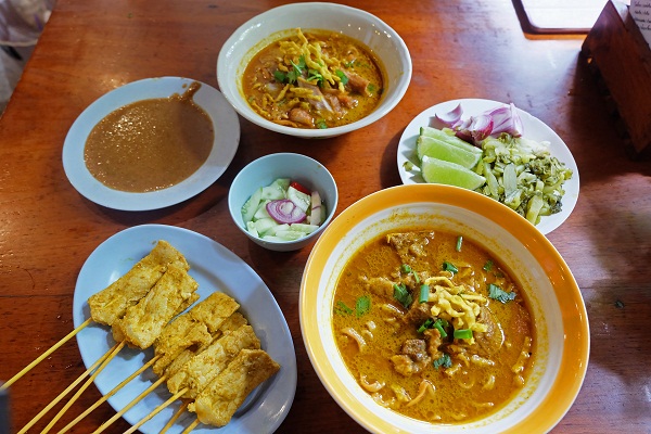 ออกจากวัดอุโมงค์มาเช็คลิสต่อไปไม่พ้นเรื่องกินค่ะ มาถึงเชียงใหม่แล้ว ต้องลองข้าวซอยหน่อย มีแนะนำกันเยอะมากๆ เลือกไม่ถูกจริงๆ ยังไม่เคยกินมาก่อนเลยลองจิ้มๆไป สุดท้ายได้ลงที่ " ข้าวซอยลำดวนฟ้าฮ่าม " เมนูมีให้เลือกเยอะนะคะ ทั้งหมู ไก่ เนื้อ ของทานเล่นก็มี หมูสเต๊ะ ปอเปี๊ยะทอด ฯลฯ เราว่าเราคงไม่ใช่คอข้าวซอยเท่าไหร่ ไม่รู้ว่ารสไหนอร่อยหรือไม่อร่อย เหมือนกินเส้นๆกับแกงๆ แงงงง ถ้าใครมีร้านเด็ดร้านอร่อย ลองแนะนำมานะ เผื่อเราจะไปลองใหม่ แต่หมูสเต๊ะโอเคเลยยย 5555555 ราคาไม่แพงค่ะ ทั้งหมดนี้ประมาน 180 บาท