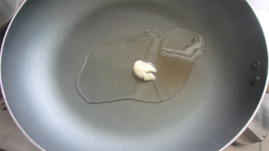 เริ่มแรกเลยเราก็ตั้งไฟอ่อน-ปานกลาง บุบกระเทียมลงไป1หัว ผัดกับน้ำมันพอนิ่ม จากนั้นนำกระเทียมออก