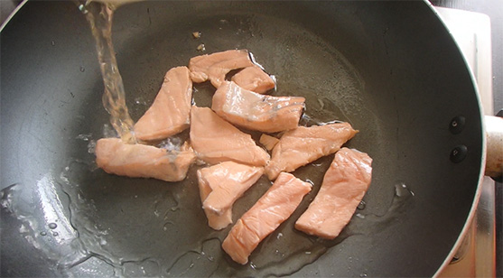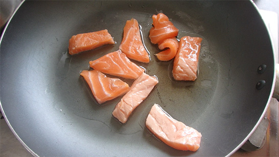 เอาแซลมอนหั่นชิ้นใส่ลงไป ผัดให้พอสุก