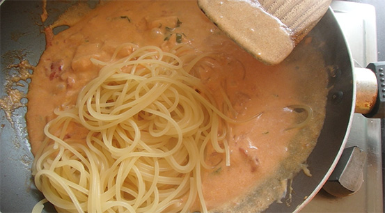ใส่เส้นพาสต้าลงไป