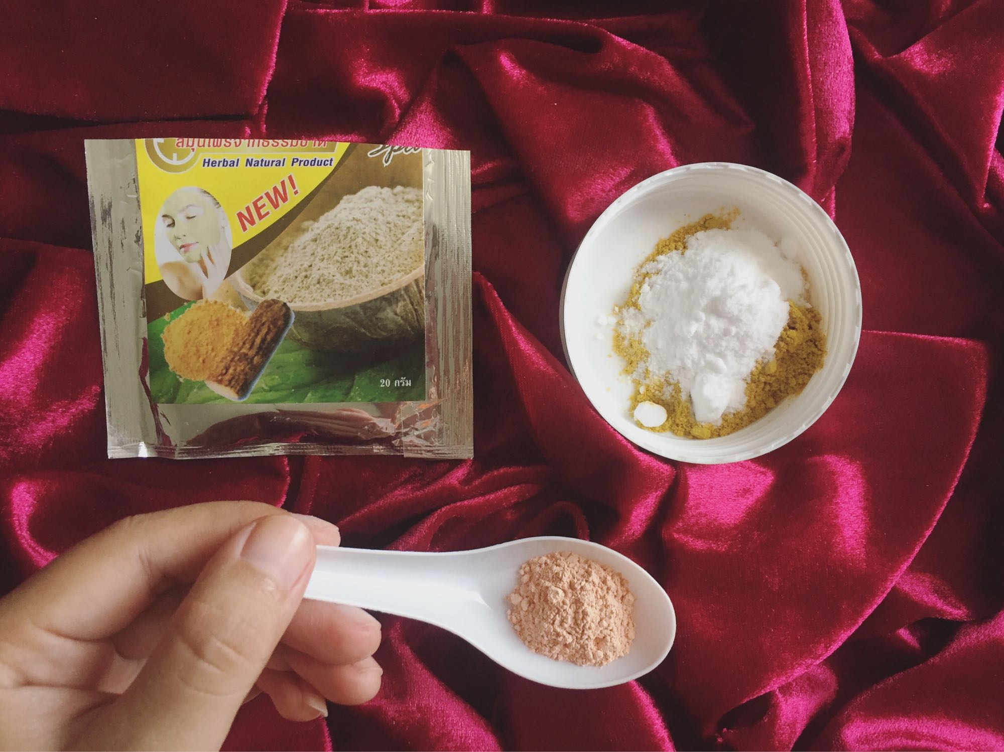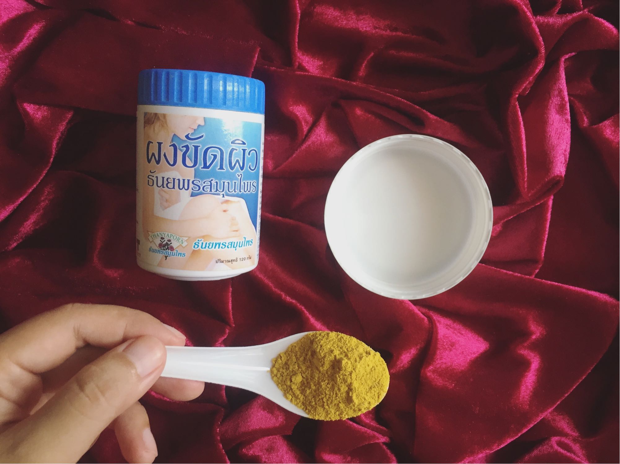 1.) ผงขัดผิวธันยพรสมุนไพร ตัวนี้เป็นผงสีเหลือง มีส่วนผสมที่ช่วยเรื่องผิวหลายตัว เช่น ไพล ขมิ้นชัน ว่านนางคำ ฯ