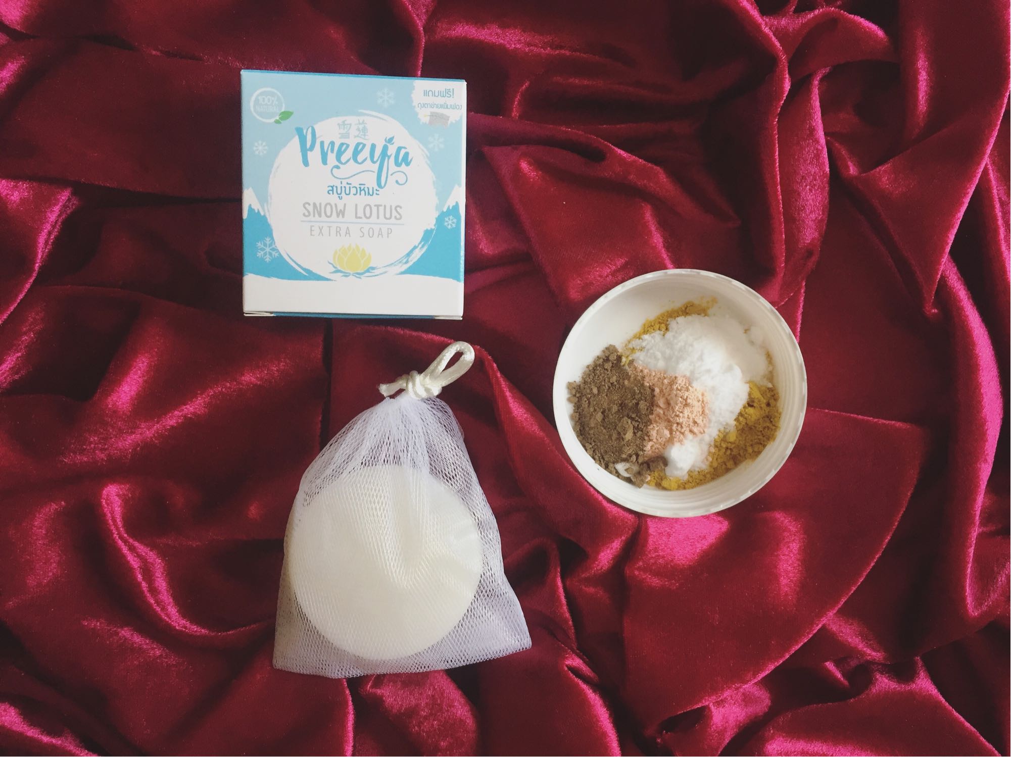 เมื่อผสมส่วนผสมครบแล้ว เราก็เตรียมสบู่บัวหิมะ Preeya อ้ะ! ลืมบอกว่าในกล่องสบู่บัวหิมะ เค้ามีตาข่ายตีฟองมาให้ด้วย ดีงามพระรามเก้า