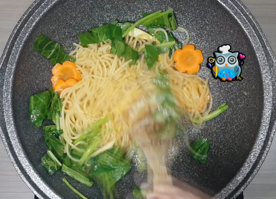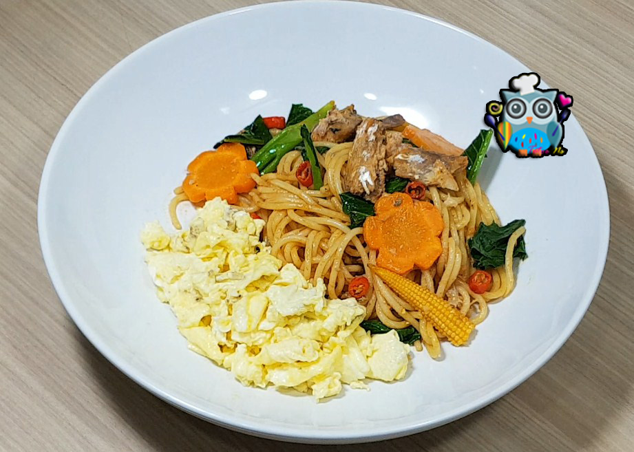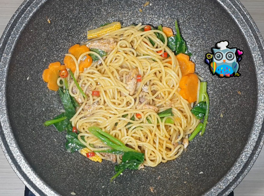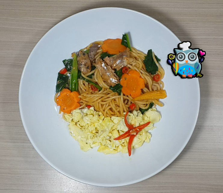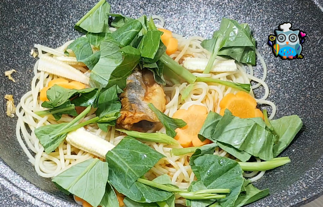 3.ตามด้วยเส้นสปาเก็ตตี้ต้มสุก ใส่คะน้า แครอท ปลากระป๋องทั้งน้ำและเนื้อ ปรุงรสด้วยน้ำตาลทราย ซีอิ้วขาว น้ำมันหอย พริกซอย