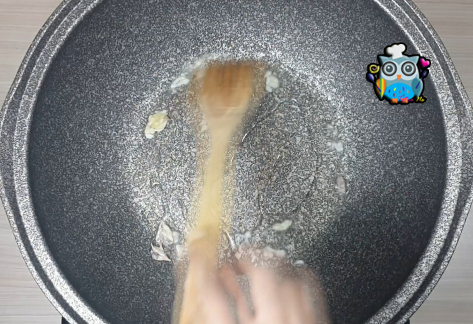 2.ตั้งกระทะให้ร้อนใส่น้ำมันพืชลงไป เริ่มร้อนใส่กระเทียมสับผัดให้หอม