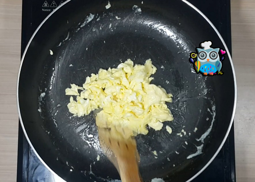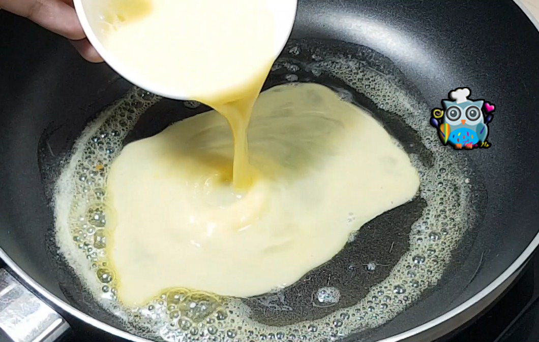 4.ตีไข่ไก่ผสมกับนมสด ตั้งกระทะเริ่มร้อนใส่เนยละลายดีแล้วใส่ไข่ไก่ลง