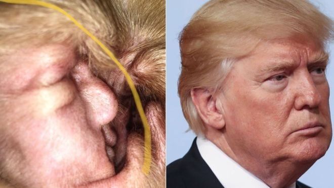 น.ส. โรบินสัน แอบสำรวจด้านในใบหูที่หนาใหญ่ของเจ้าชีฟขณะที่มันกำลังหลับ เพื่อถ่ายภาพส่งไปให้สัตวแพทย์วินิจฉัยอาการผิดปกติที่มีมาระยะหนึ่งแล้ว แต่เมื่อเธอโพสต์ภาพนี้ทางออนไลน์ เพื่อนคนหนึ่งได้ชี้ให้เห็นว่า รูปด้านในหูของเจ้าชีฟช่างเหมือนกับประธานาธิบดีโดนัลด์ ทรัมป์ ไม่ผิดเพี้ยน แม้แต่ขนอ่อนในหูก็ยังดูเหมือนผมสีทองที่จัดทรงจนตั้งพองของนายทรัมป์