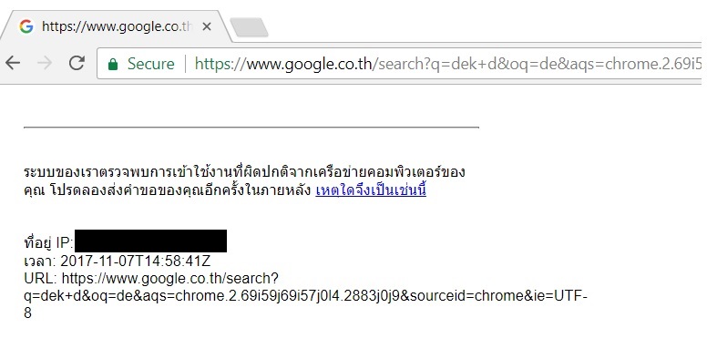 คือ ทางระบบ Google เขาจำ IP น่ะครับ ว่า IP เลขนี้ที่คุณใช้อยู่ มีการเรียกใช้งาน ค้นหาผิดปกติ