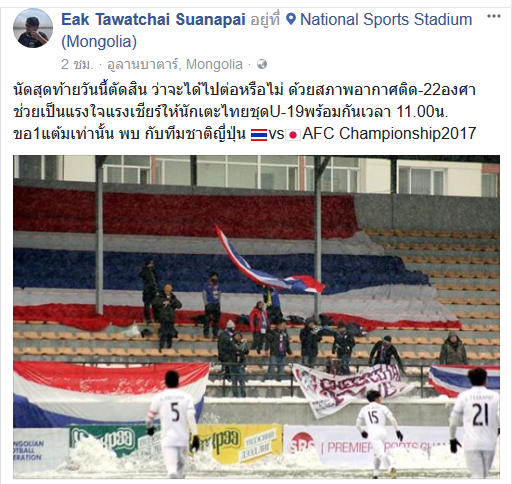 แฟนบอลไทยที่ไปเชียร์น้องๆ U-19 รายงานว่าที่สนามตอนนี้อุณหภูมิอยู่ที่ (-22) องศา !!