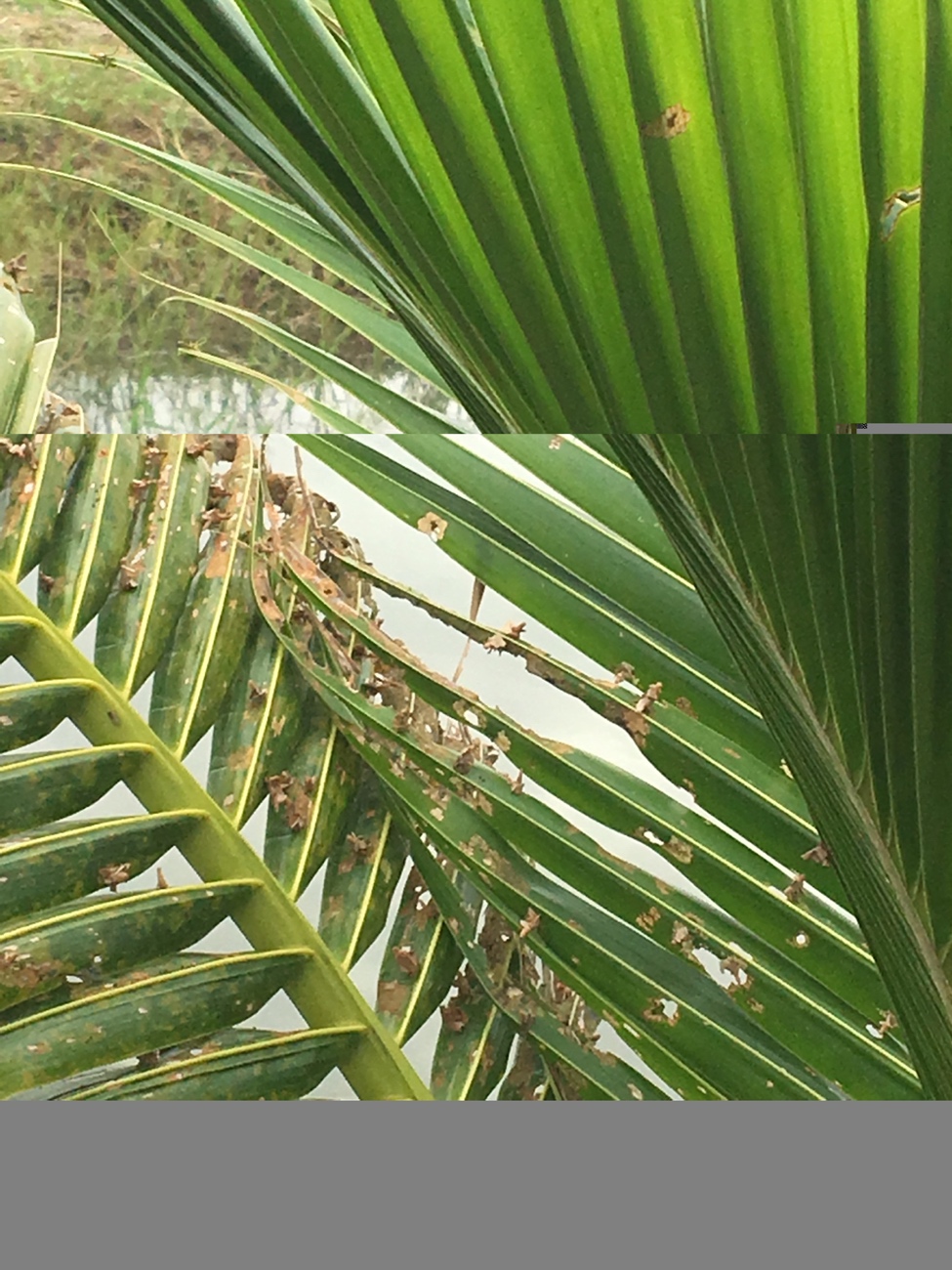 ไม่รู้ว่าเกิดโรคก่อน แล้วจึงมีรอยเจาะเป็นจุด ๆ คล้ายมวนมะม่วง มวนลำไย น่ะค่ะ หรือเกิดจากแมลงเลย มีลักษณะใบเหลืองเป็นใบ ๆ แล้วเครือผลมีลักษณะแกร็น มันไม่ลามไปทั่วทั้งกอ แต่ก็มีลักษณะคล้ายโรคติดต่อ คื