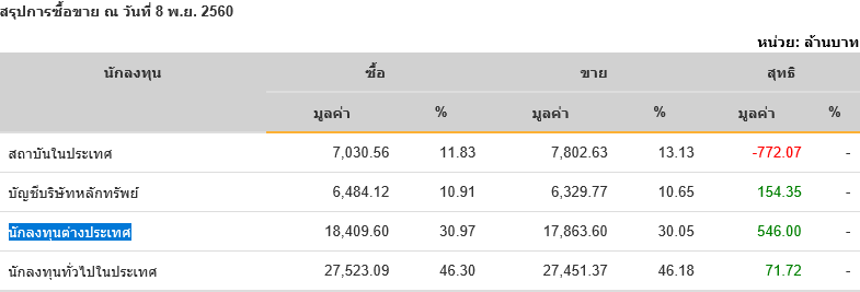 Sinthorn Summary 8/11/2560 : ต่างชาติซื้อสุทธิ 546.00 ลบ.