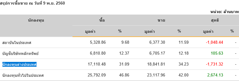 Sinthorn Summary 9/11/2560 : ต่างชาติขายสุทธิ -1,731.32 ลบ.