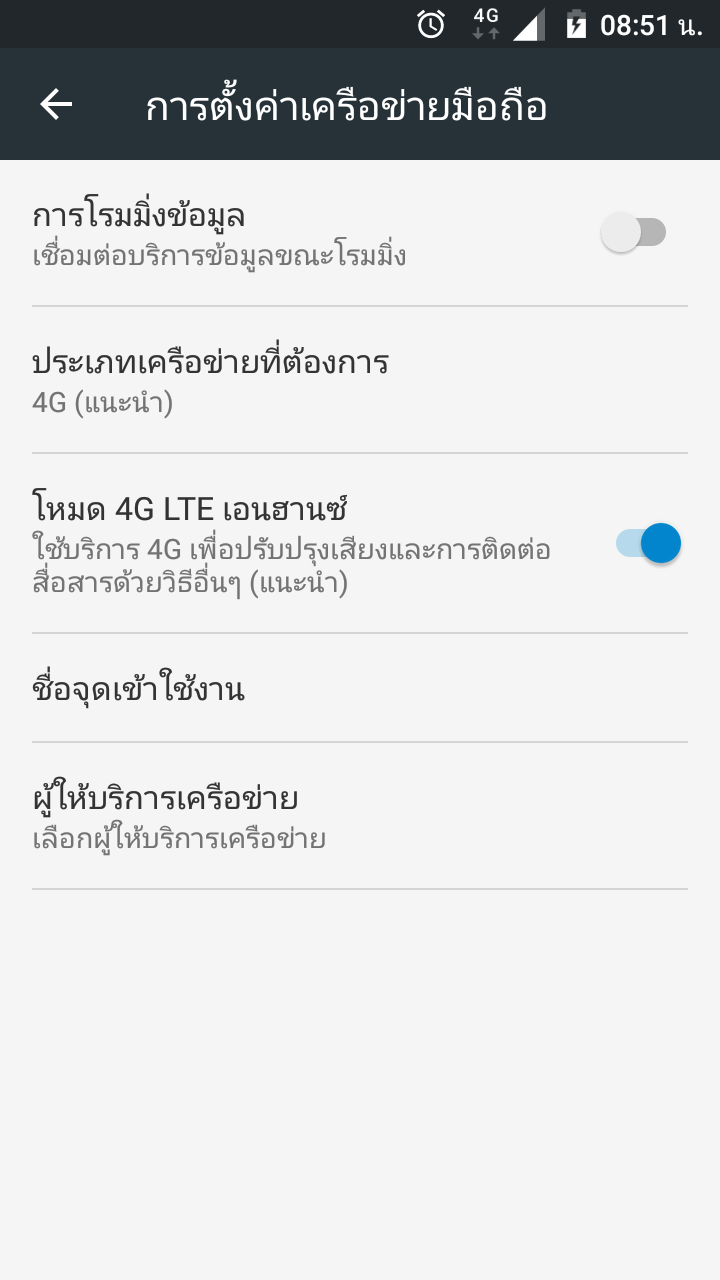 เห็นเครื่องคนอื่นเป็น TRUE-H 26 กัน ลองเปลี่ยนซิมไปมาก็ยังไม่มี carrier update เตือนขึ้นมา ตั้งค่า 4G ให้เป็น voice & data ก็ไม่ได้ (มันไม่มีเมนูให้เลือกเลย)