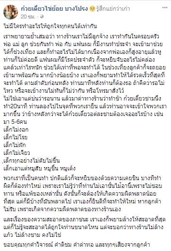 หลังจากนั้นผมก็เล่น ROV จบไป 2 ตา ซึ่งเวลาเฉลี่ย ประมาณ 20 นาทีแล้ว แต่อาหารก็ยังไม่มาส่ง ผมจึงลุกไปตาม พ่อค้าบอกว่ากำลังทำอยู่ แต่สิ่งที่ผมเห็นคือ พ่อค้าสูปบุหรีไปด้วยและทำอาหารไปด้วย อืมมมม เหมือนเดิมความสะอาดยังไม่มีเหมือนเดิม เพิ่มเติมคือ ทำนานมากกกจนคนออกหมดร้านแล้ว ก็ยังทำไม่เสร็จ ซึ่งปัญหาความสะอาด ทำให้ผมรู้สึกไม่ดีอยู่แล้วเจอปัญหาทำช้าอีก ซึ่งถ้าร้านก๋วยเตี๋ยวปกดิจะใช้เวลาไม่นาน ไม่เกิน 10 นาทีได้ทานแน่นอน แต่นี่ ลูกมือก็มี คนเสิฟ ก็มี แต่ก็ยังช้า กว่าจะได้ทาน ก็ปาไป 13: 10 โดยประมาณซึ่งมันนานกว่าปกติมากก ยังไม่พอ พอผมต่อว่า ว่านานไป และไม่สะอาดก็ยังมีการมาดราม่าอีก คือไม่ยอมรับว่าสิ่งที่ทำมันไม่ถูก เพื่อนๆของเจ้าของร้านก็เข้ามาอวยกันใหญ่ อ้างไปเรื่อย คือถ้าแฟนและพ่อที่เป็นลูกมือป่วย หรือไม่พร้อมที่จะบรอการก็อย่าเปิดร้านเลยครับ ถ้ามันจะลำบากขนาดนั้น หรือไม่ก็จ้างลูกมือเถอะครับ ส่วนลูกค้าจะสั่งอะไรกิน ก็เขียนไว้ในออเดอร์แล้ว แต่พ่อค้าก็ควรทำให้ถูกเพราะลูกค้าเป็นคนเลือก แต่ก็ยังจะทำมาผิดอีก แล้วพ่อค้าก็มาดราม่าใส่ลูกค้า เฮ้ออออ แบบนี้ก็ได้แฮะ