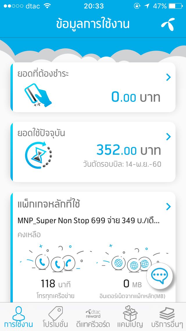 ตอนนี้ผมใช้แพคเกจ Super Non-stop ของ dtac อยู่ ซึ่งประกอบด้วย - Internet 10GB+10GB(12รอบบิล) - โทร 300 นาที ในราคา 349 บาทต่อเดือน(จาก 699 บาท) กำลังจะหมด 12 รอบบิลวันที่ 4 ก.ย. นี้ หลังจากนั้นต้องจ