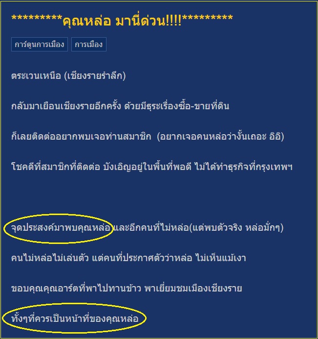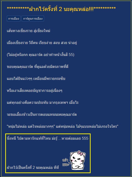 ด่าผมอย่างไพเราะว่า มืงไปนัดผู้หญิงที่ไหนไว้ ชะ ๆ ตามขึ้นมาหากันถึงเชียงราย