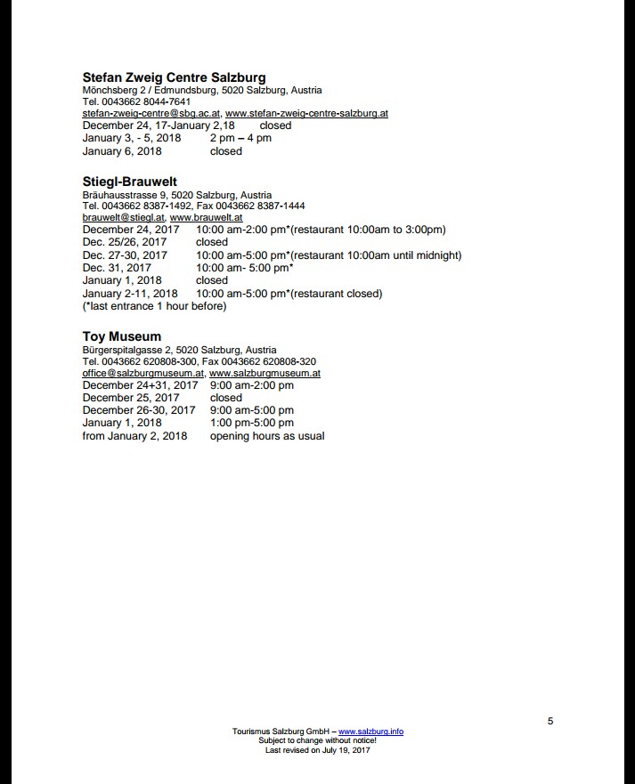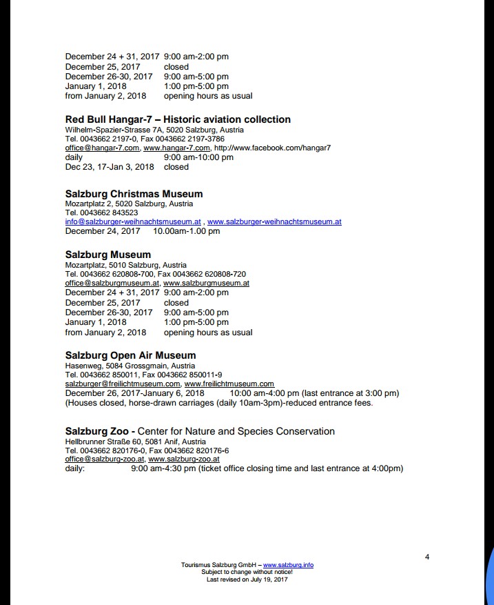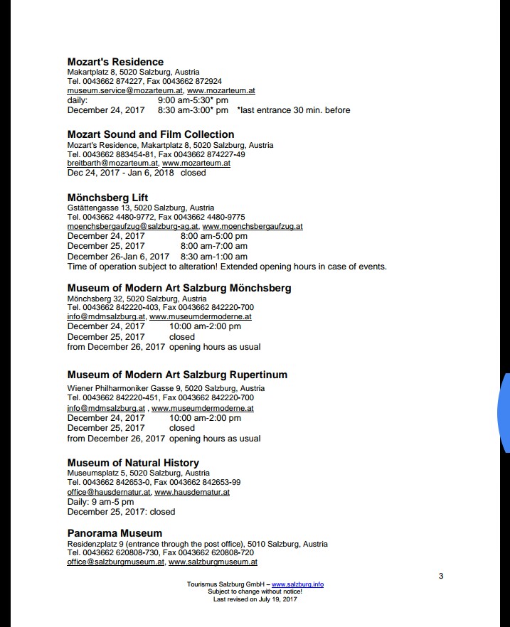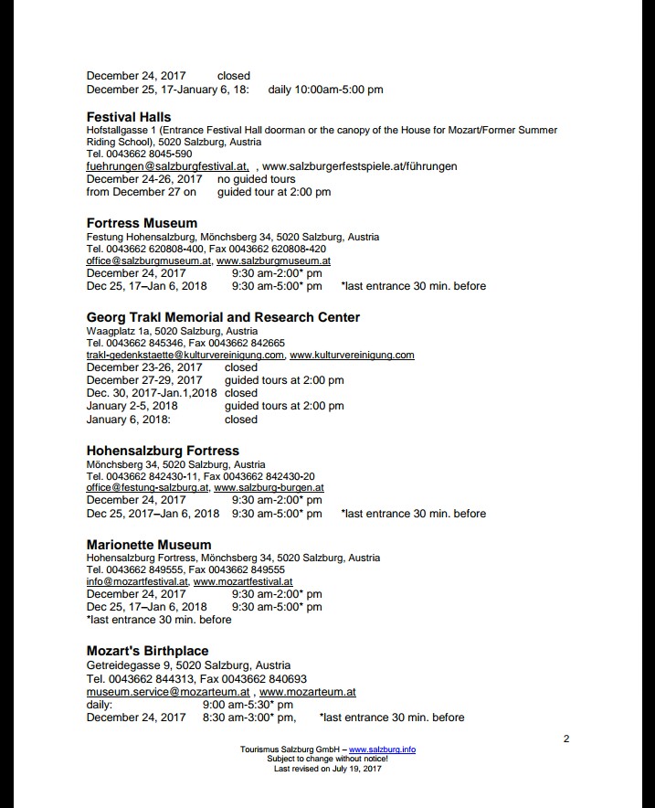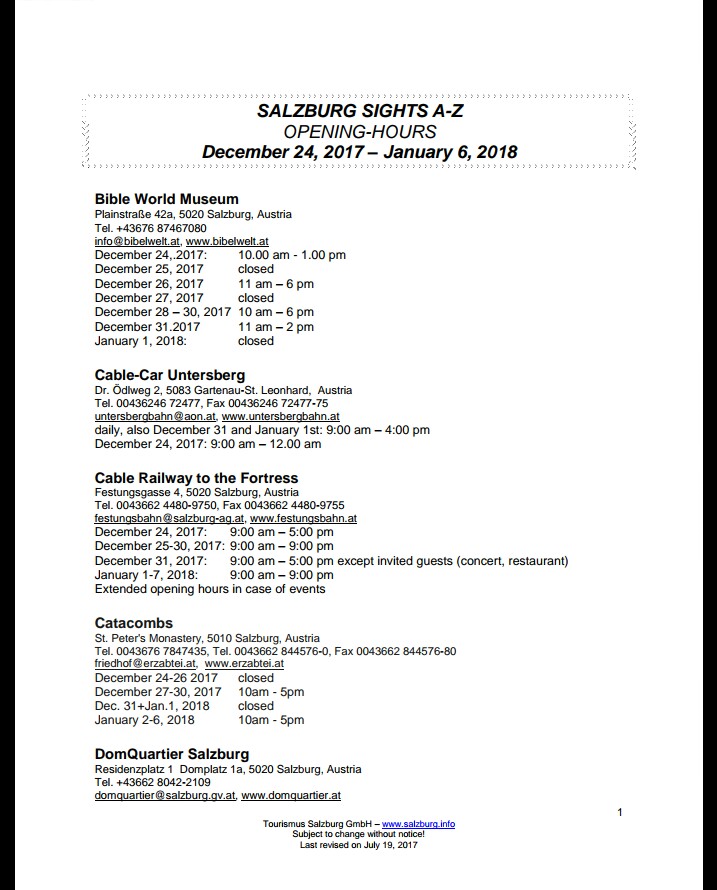 วันและเวลาเปิดสถานที่ท่องเที่ยวใน Salzburg ช่วงคริสต์มาส 2017 ถึงปีใหม่ 2018