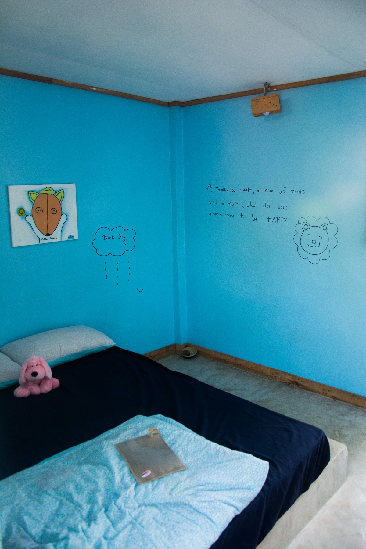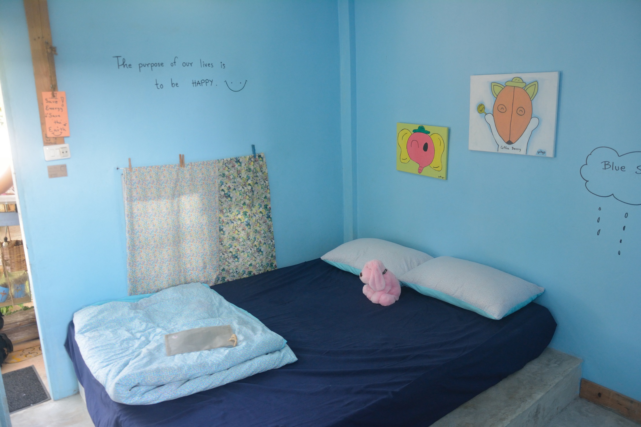 ภายในห้องตกแต่งด้วยสีฟ้าตามชื่อห้อง Sky เลยครับ มีการวาดรูปน่ารักๆ ตามผนังห้องด้วย เรียกได้ว่าทั้งสบายตาจากสีฟ้าและอมยิ้มจากตัวการ์ตูนน่ารักๆ เลยทีเดียว