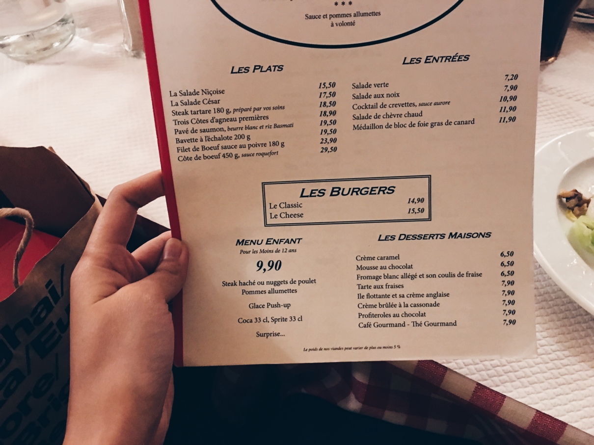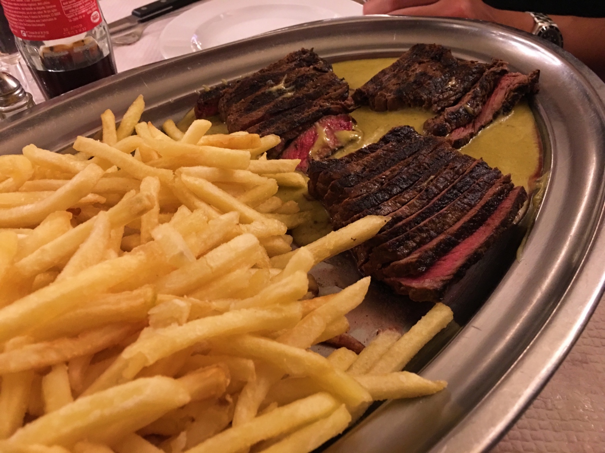 เดินมาถึงหน้าร้านก็จะมีเมนูแผ่นเบ้อเร่อแปะอยู่ เมนูแนะนำที่ตัวใหญ่และเห็นชัดมาแต่ไกลก็เห็นจะเป็นเนื้อนี่แหละ เป็นเนื้อย่าง (มั้ง) เสิร์ฟมาบนถาดใหญ่ยาว พร้อมเฟรนช์ฟรายไม่อั้น ราดมาพร้อมน้ำจิ้มสีเขียวครีมข้น ตกอยู่ที่ราคาเมนูละ 22.50€ ดูท่าทางจะเป็น signature ของทางร้าน เพราะตอนไปนี่ไปยืนรอเพื่อนอยู่ มองเข้าไปในร้านก็จะเห็นเกือบทุกโต๊ะสั่งเจ้าเนื้อจานนี้มากินกัน จานใหญ่มากกกกกกกกก