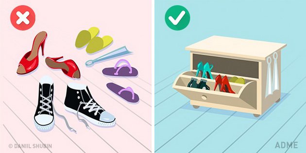 การวางรองเท้าไว้ระเกะระกะบริเวณหน้าบ้าน ย่อมทำให้บ้านดูไม่น่าอยู่และดูแคบอีกด้วย ลองมองหากล่องสำหรับเก็บรองเท้า จะช่วยให้พื้นที่ดูสะอาดและเป็นสัดส่วนขึ้น