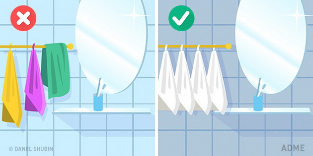 การแขวนผ้าเช็ดตัวหรือผ้าขนหนูหลากสีสันไว้ในห้องน้ำ อาจจะทำให้ห้องดูรกและทำให้อึดอัดได้ ลองเปลี่ยนไปใช้ผ้าสีขาวแทน เพียงเท่านี้ก็จะรู้สึกว่าห้องน้ำดูเบาสบายขึ้นแล้วล่ะ