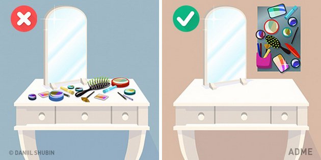 ทริคนี้จะช่วยให้โต๊ะเครื่องสำอางค์ของสาวๆ สะอาดและเป็นระเบียบเรียบร้อย เพียงนำแผ่นบอร์ดโลหะเป็นรูปสี่เหลี่ยมติดไว้ข้างกระจก ติดแม่เหล็กกับเครื่องสำอางค์ต่างๆ จากนั้นก็เอาไปแปะติดกับแผ่นบอร์ดโลหะ