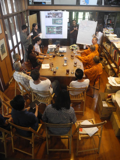 พอได้แบบที่แน่นอน ทีมงานก็จัดเวทีแลกเปลี่ยนเรียนรู้ระหว่างนักออกแบบของทั้ง ๙ วัด มาเล่าโจทย์ต่างๆ ให้ฟังว่าทำงานแก้ปัญหากันอย่างไร ได้เรียนรู้อะไรบ้าง รวมถึงได้นิมนต์เจ้าอาวาสและพระสงฆ์ของแต่ละวัดมาร่วมเรียนรู้ด้วย ทำให้ทั้งพระและนักออกแบบเริ่มมองเห็นทิศทางการพัฒนาไปในทางเดียวกันและเป็นรูปธรรมมากขึ้น