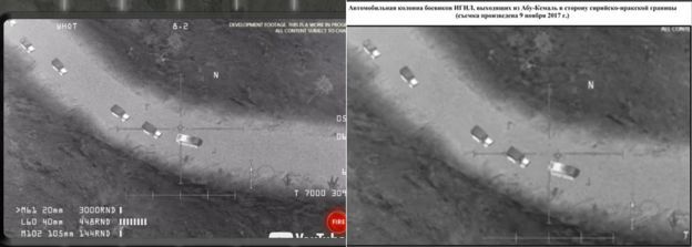 รัสเซียอ้างว่าสหรัฐฯ กำลังร่วมมือกับกลุ่มที่เรียกตัวเองว่ารัฐอิสลาม ด้วยการเป็นโล่ห์กำบังให้นักรบไอเอสที่กำลังหลบหนี โดยในโพสต์ทางเฟซบุ๊กของกระทรวงกลาโหมรัสเซีย ระบุว่า กองกำลังรัสเซียได้ร่วมกับกองกำลังทหารซีเรีย ชิงเมืองอาบู คามาลคืนจากไอเอส เมื่อสัปดาห์ที่ผ่านมา แต่กองกำลังพันธมิตรที่นำโดยสหรัฐฯ ปฏิเสธที่จะให้ความร่วมมือตามคำร้องให้ "กำจัดขบวนรถไอเอสที่กำลังหลบหนี"