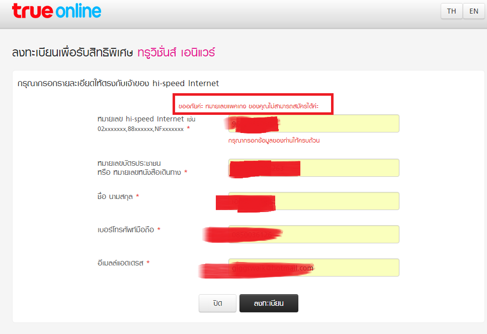 สมัคร True Anywhere ไม่ได้ ทั้งที่เป็นลูกค้าทรู