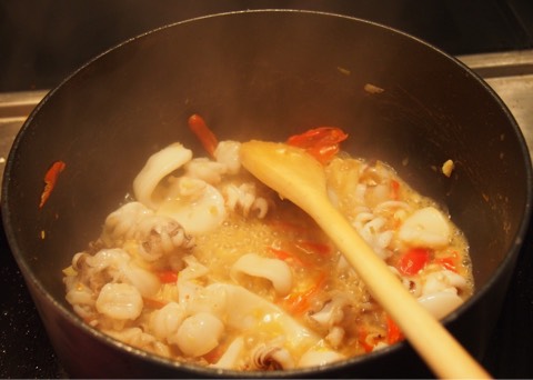 แล้วก็ใส่ปลาหมึกที่หั่นเตรียมไว้