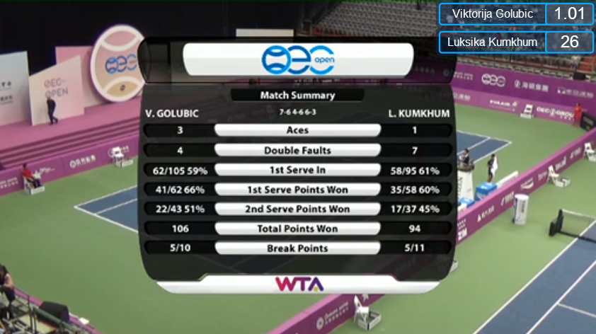 ลักษิกา คำขำ มือ 126 โลก แพ้ Viktorija Golubic (SUI , มือ 116 โลก) 1-2 Set 6-7(1) 6-4 3-6