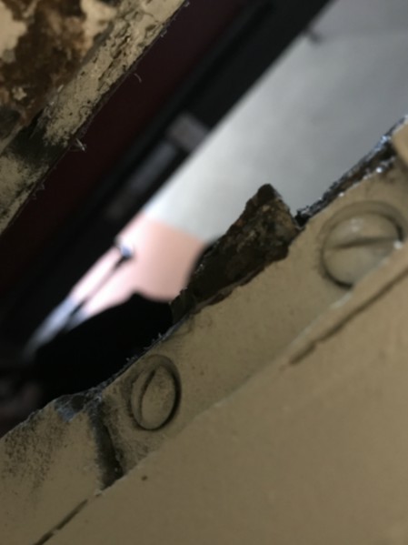 แต่พอจะปิดประตู บานพับด้านบนของประตูก็หักลงมา พอสังเกตที่บานพับเห็นว่าเก่ามากและเป็นสนิม