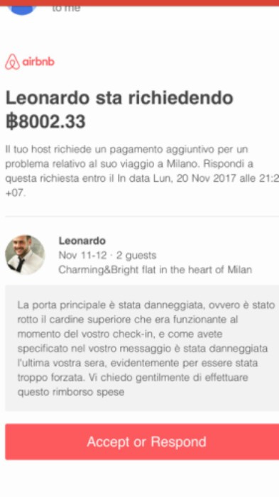 พัก Airbnb ที่มิลาน 1 คืน บานพับประตูหลุด1อัน โดนเรียกค่าเสียหาย 8,000 บาท (มีรูป)