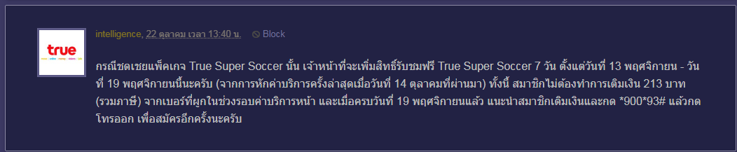 และผมได้รับหลังไมค์จากทางคุณ intelligence มาว่า จะชดเชยวันในการดู package supersoccer ให้จากเดิมหมดวันที่ 14/11 ไปเป็นหมดวันที่ 19/11 ตามนี้