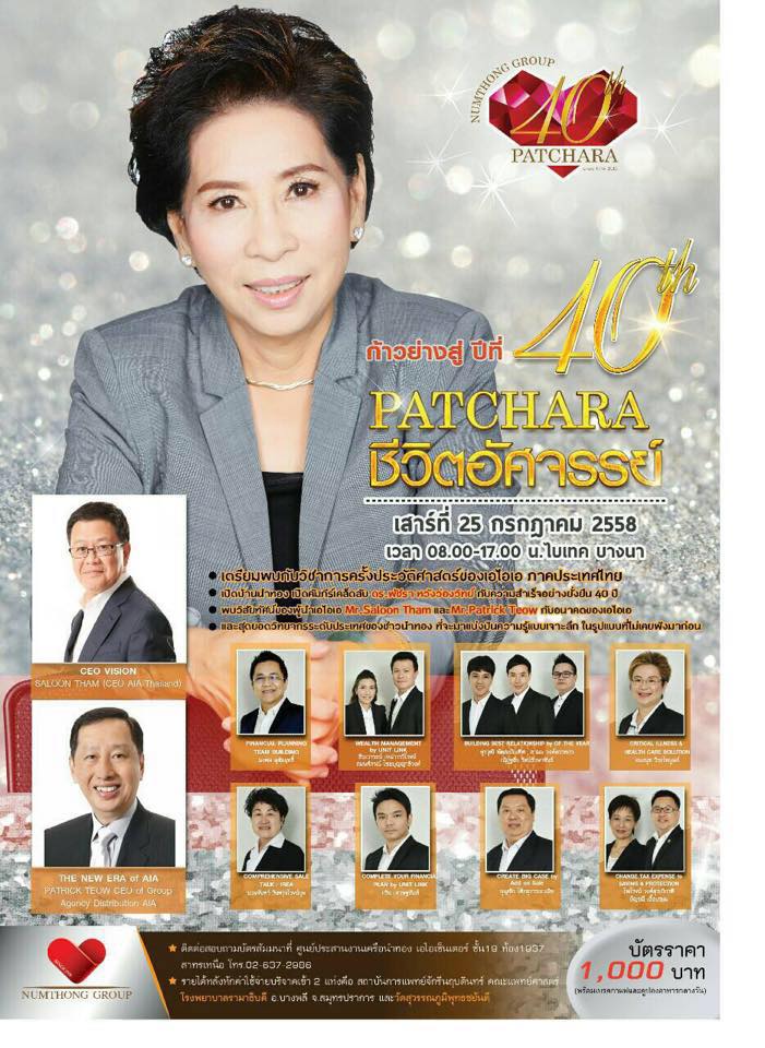 ตลอดระยะเวลา 30 ปีที่ผมทำงานในธุรกิจประกันชีวิต ผมไม่คิดว่าจะมีใครที่ยิ่งใหญ่และโดดเด่นในฐานะนักขายเทียบเท่าคุณพัชรา หวังว่องวิทย์ ผู้อำนวยการภาคระดับสูง ภาคนำทอง ของบริษัท เอไอเอ จำกัด ได้อีกแล้ว ท่านโดดเด่นทั้งด้านงานขายส่วนตัวและการบริหารทีมขาย สามารถสร้างทีมงานภายใต้ชื่อ”นำทอง”ที่ยิ่งใหญ่ที่สุด ด้วยจำนวนหน่วยงานภายใต้การดูแลถึง 430 หน่วย มีตัวแทนรวมกันกว่า 5,000 คน มีผลผลิตเบี้ยประกันภัยปีแรก(FYP) รวมกันสูงถึง 1,000 ล้านบาทติดต่อกันหลายปี ส่วนยอดขายภายในหน่วยงานตรงของท่านเอง ก็อยู่ที่ระดับ 40-50 ล้านบาททุกปี แน่นอนว่าตัวเลขดังกล่าวนี้ ท่านขายมาด้วยตัวเองกว่าครึ่งหนึ่ง