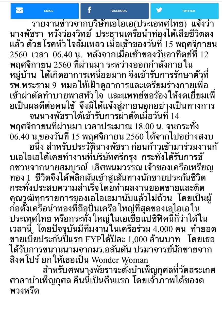 เช้าวันพุธที่ 15 พฤศจิกายน พ.ศ.2560 เวลาประมาณ 8.00 น. ขณะที่ผมกำลังอ่านหนังสือพิมพ์ฉบับเช้าวันนั้น จู่ๆก็มีโทรศัพท์ถึงภรรยาผม เมื่อเธอคุยสายสักครู่ เธอก็ร้องไห้โฮออกมาเสียงดัง จนผมต้องเดินไปปลอบ เธอได้แต่ละล่ำละลักว่า “เจ้พัชเสียแล้ว เจ้พัชเสียแล้ว” ผมรู้สึกเหมือนอะไรจุกที่คอหอย เราทุกคนรู้ว่า วันหนึ่งเรื่องแบบนี้ต้องเกิดขึ้น แต่ไม่มีใครคิดว่ามันจะเกิดขึ้นรวดเร็วเช่นนี้
