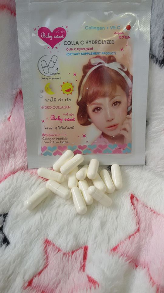 คือ คอลลาเจนค่ะ แต่ในรูปแบบแคปซูลซึ่งทานง่ายและราคาดีงาม จำนวนเหมาะสมกับราคาค่ะ ปลอดภัยมีอย.ด้วยค่ะ สาวๆสามารถเช็คได้จากข้างกล่องค่ะ ถ้าพูดถึงคอลลาเจนคงนึกถึงความขาวอย่างเดียวใช่มั้ยคะ แต่คอลลาเจนเบบี้สวีทตัวนี้ ช่วยปัญหาได้หลายเรื่องค่ะ ทั้ง สิว ฝ้า กระ จุดด่างดำ รอยคล้ำ ฝ้าต่างๆ รวมทั้งริ้วรอย คอลลาเจนอะไรทำได้มากขนาดนี้ในราคา 69.- บาท ตอนแรกไม่เชื่อนะคะ แต่พอเราเปิดใจ ลองทานจริงจังสักระยะ แค่1-2 ซองก็เริ่มเห็นผลคือรอยสิวจางลงค่ะ แถมคอลลาเจนเค้านำเข้าจากญี่ปุ่นด้วย มีรีวิวมากมาย โดยปกติ 1 ซองมี 14 เม็ดค่ะ ทานวันละ 1 ครั้งครั้งละ 2 เม็ด แนะนำให้ทานตอนท้องว่างจะดีที่สุดค่ะ เพราะจะซึมซาบเข้าร่างกายได้ง่าย แถมไม่รอพรี หาซื้อได้ง่าย ปลอดภัย นอกจากทานแล้วสวยแถมซื้อ 10 ซองหรือ 1 กล่องก็ได้เป็นสมาชิกแล้วค่ะ มาดูภาพ ก่อนและหลังทานค่ะ ต่างได้ชัดมาก ทั้งทาตัว ทาหน้า ทานคอลลาเจน