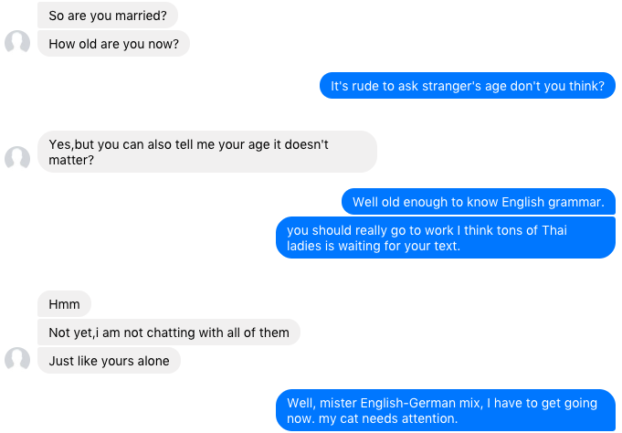 พอเรากดรับก็จะเริ่มทักแชตทันที ถามเรื่องส่วนตัวไวมากกก สังเกตดีๆ ภาษาอังกฤษพวกนี้จะกากๆหน่อย เช่นใช้ตัวอักษรใหญ่เล็กมั่วๆ