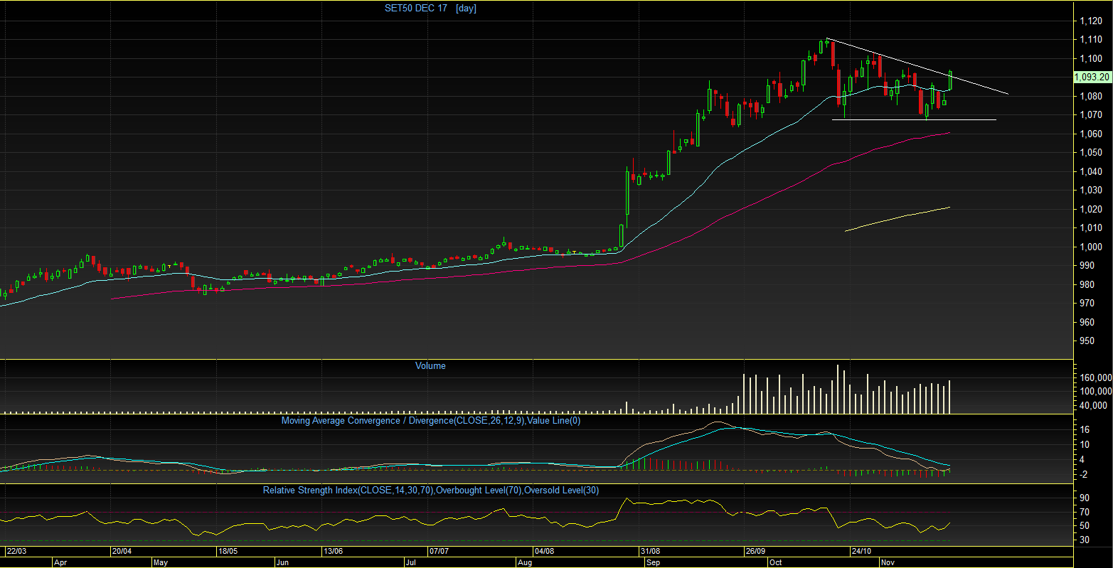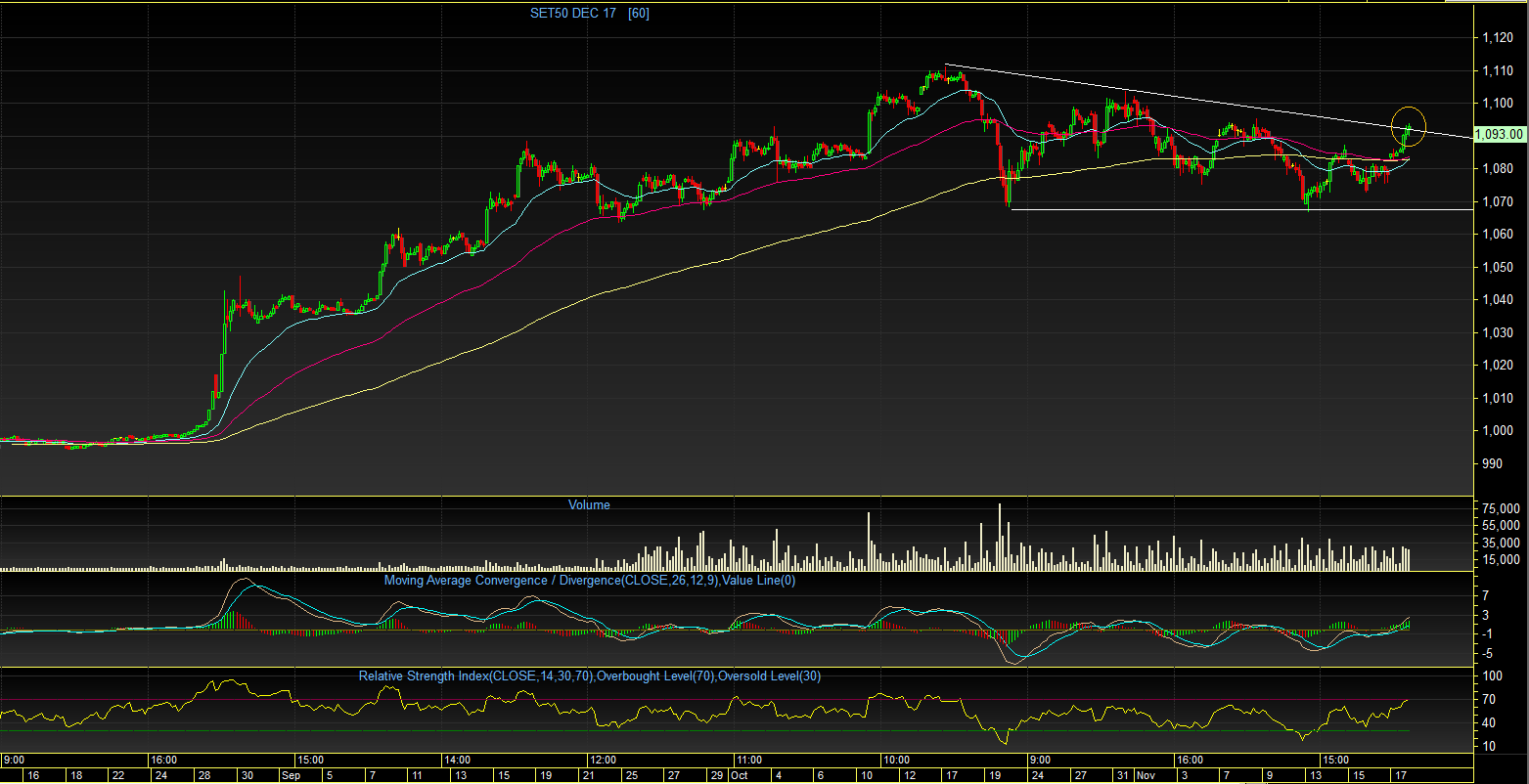 เเละได้มาทดสอบกรอบแนวต้าน ของสามเหลี่ยม "Descending Triangle" ซึ่งถ้าหากวันนี้ดัชนียังคงพุ่งทะยานขึ้นไปได้ต่อ